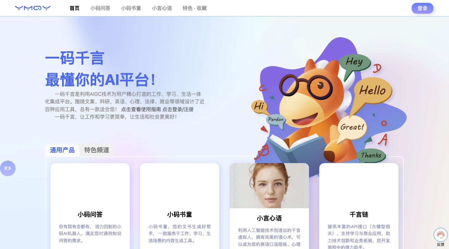 • 产品简介: 一码千言是一款AI工具合集平台,涵盖了工作、学习、生活所需的AI在线工具。让工作和学习更简单,让生活和社会更美好