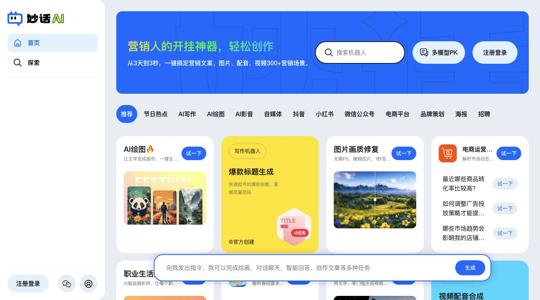 妙话AI,为您研制的在线AI智能体集合平台,根据您的需求轻松实现智能写作、模拟角色语音对话、自动绘画生成;大量AI机器人让您快速上手;轻松完成您的AI工具需求。